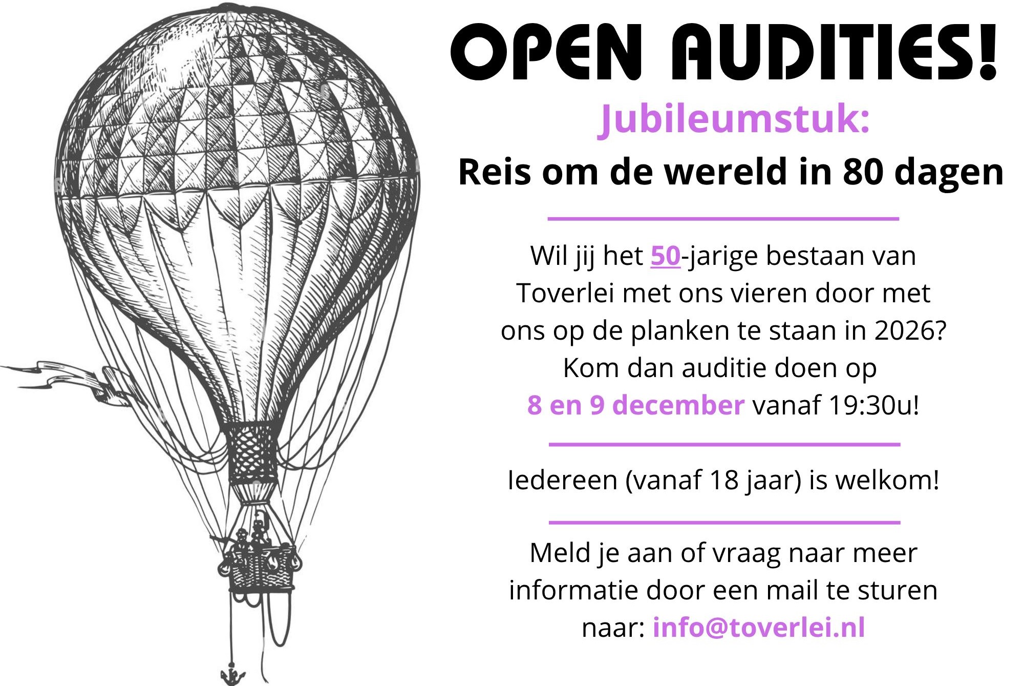 Altijd al toneel willen spelen, of is het de hoogste tijd deze hobby weer eens op te pakken? Ben je minimaal 18 jaar? Kom dan auditie doen!